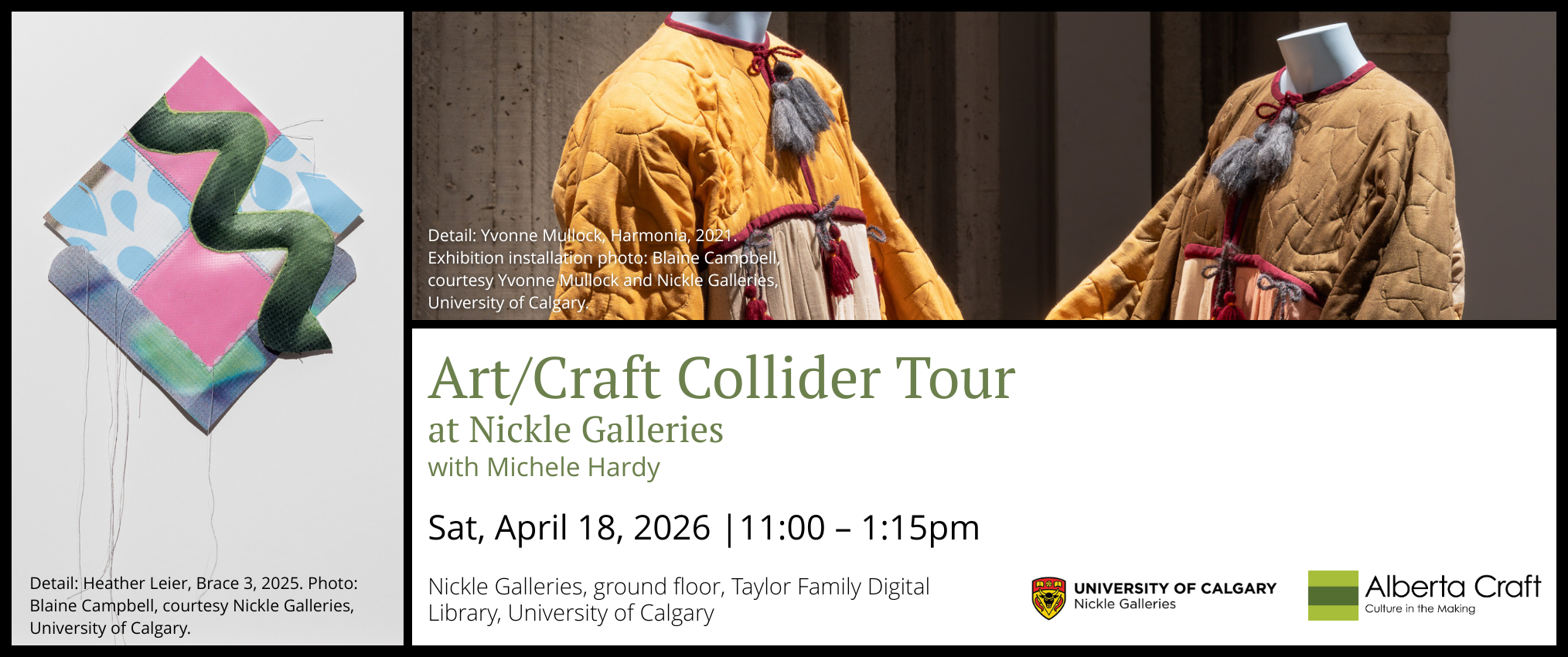 Join Michele Hardy, for a tour of Nickle Galleries’ newest exhibitions, Yvonne Mullock: Why don’t you… and Heather Leier: Practice Pinny exploring the work of two Calgary-based women artists unafraid of blurring boundaries. Following the exhibition tour, Hardy will offer a behind-the-scenes visit to the textile vault where we will examine recent textile acquisitions that similarly bridge art and craft including works by Wendy Toogood, Pat Adams, Laura Vickerson, Mackenzie Kelly-Frère and Richard Boulet, amongst others.