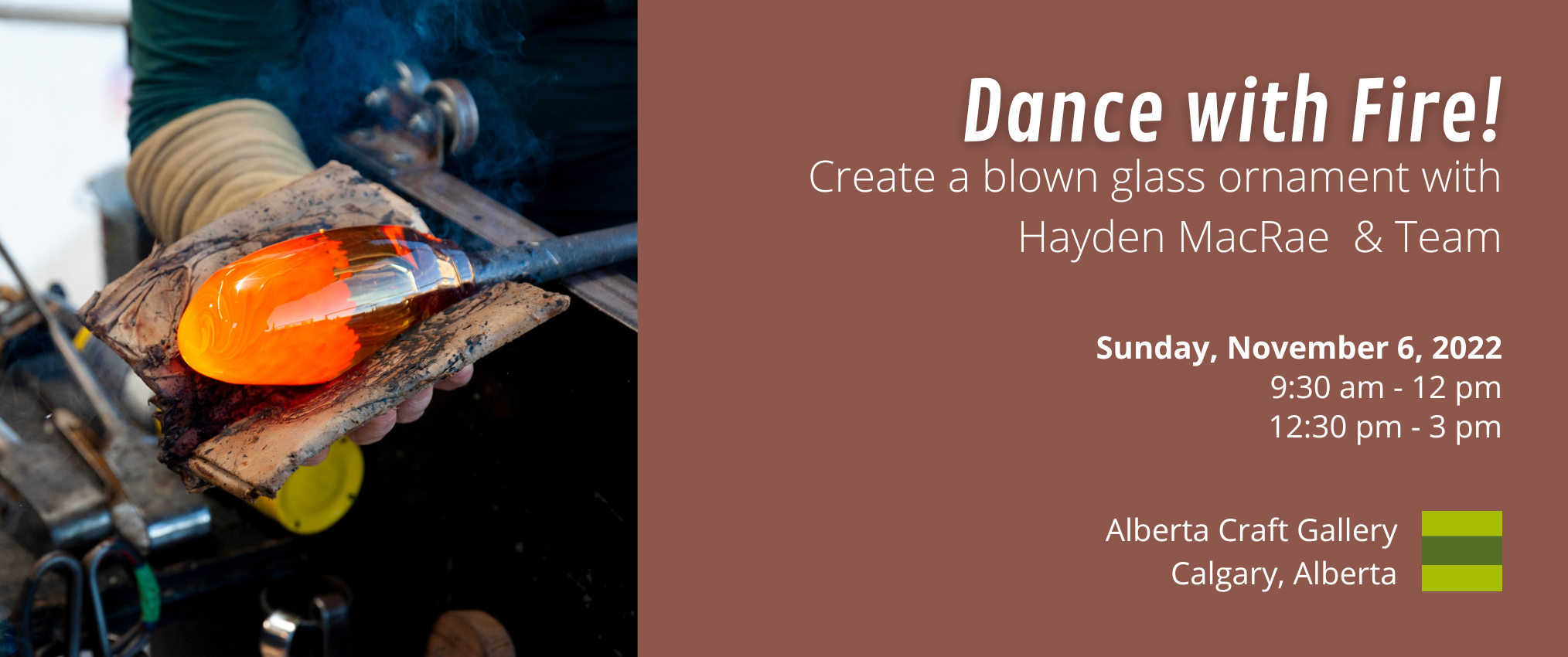 Join the Alberta Craft Gallery, Hayden MacRae and his team for a trip back in time. Step into Fascapple Glass where molten glass flows like honey and you can experience this ancient art. Watch an artist transform a blob into beauty, learn about the tools and equipment, hear a bit of history, peruse our gallery, and simply enjoy hanging out in the hot shop. It’s a great Sunday escape. You’ll get a hands-on experience creating an ornament with the assistance of a professional glassblower.