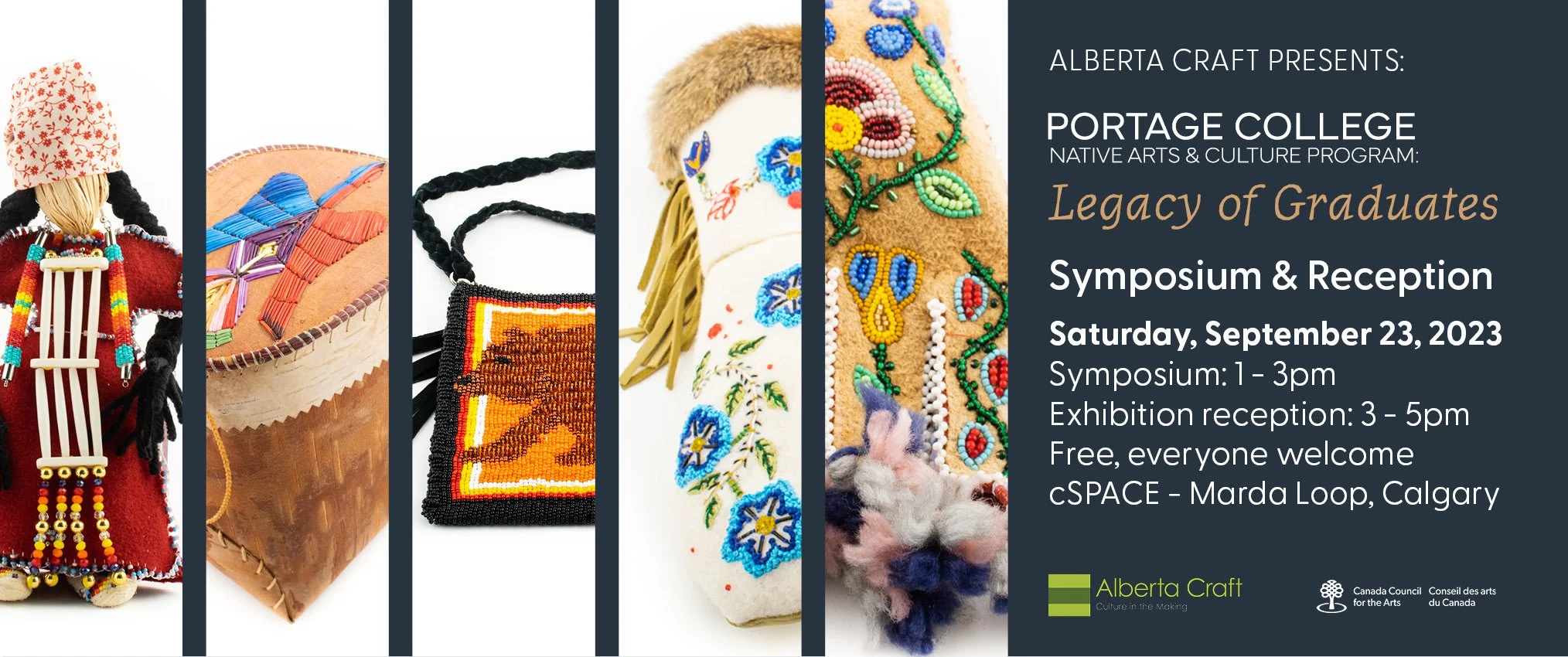 Join Alberta Craft and the artists of the Portage College Native Arts and Cultural Program: Legacy of Graduates Exhibition for an in person Symposium and Exhibition Reception on Saturday, September 23, 2023. The Symposium starts at 1 pm in the Theatre (bottom floor, cSPACE - Marda Loop), followed by a reception for the exhibition from 3 - 5pm, upstairs in the Alberta Craft Calgary Gallery (#280).