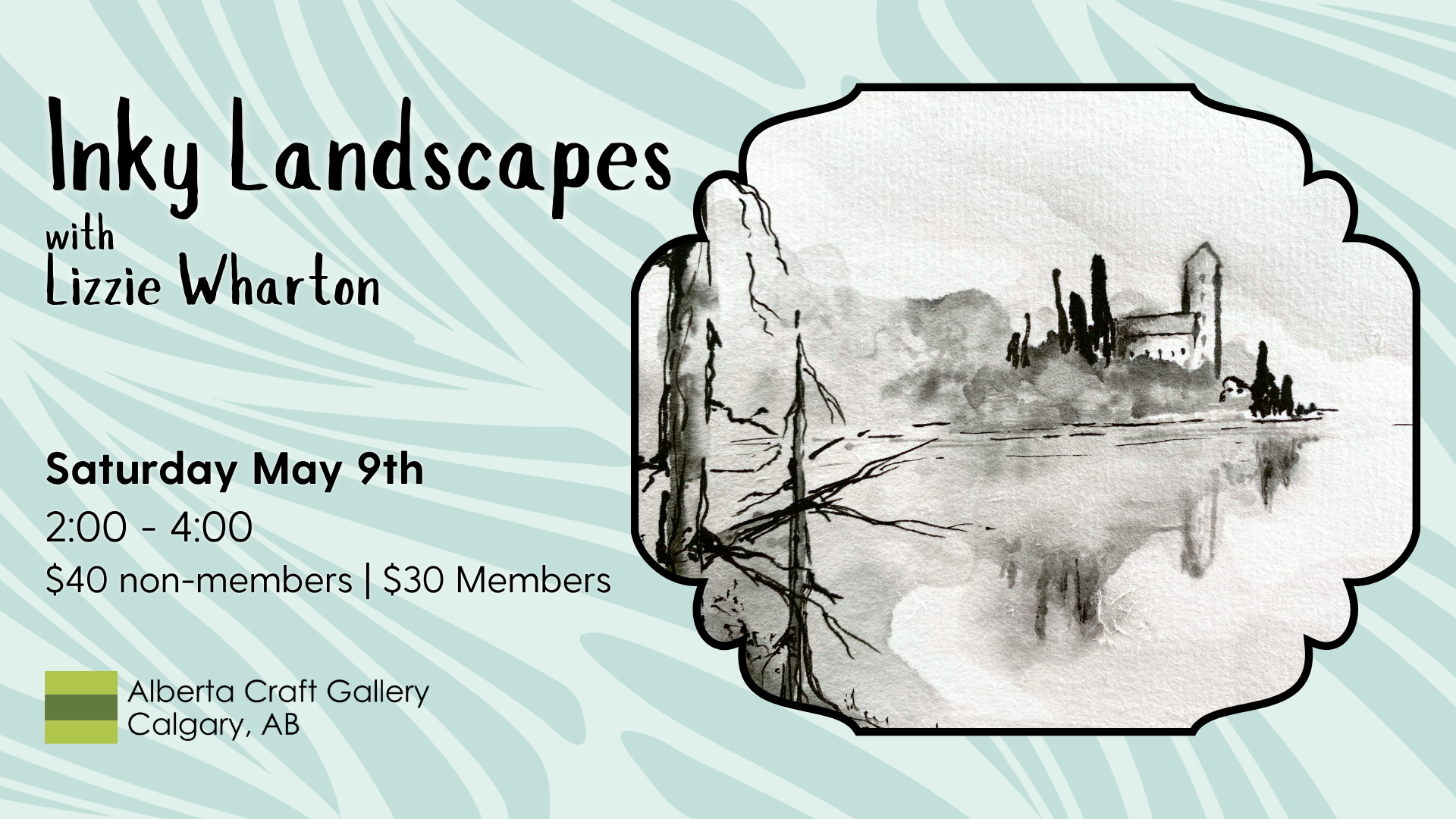 Create your own unique card and bookmark design while learning the basics of ink and watercolour painting in this beginner-friendly workshop! Participants will learn brush techniques and landscape painting taught by local artist Lizzie Wharton to create personalized final pieces. Bring your own landscape photos to reference, use the references provided, or use your imagination and let the materials bring it to life. All materials will be supplied, so just bring your creativity and desire to learn! Working with ink can get messy, so please come in clothes you don't mind getting a bit dirty.